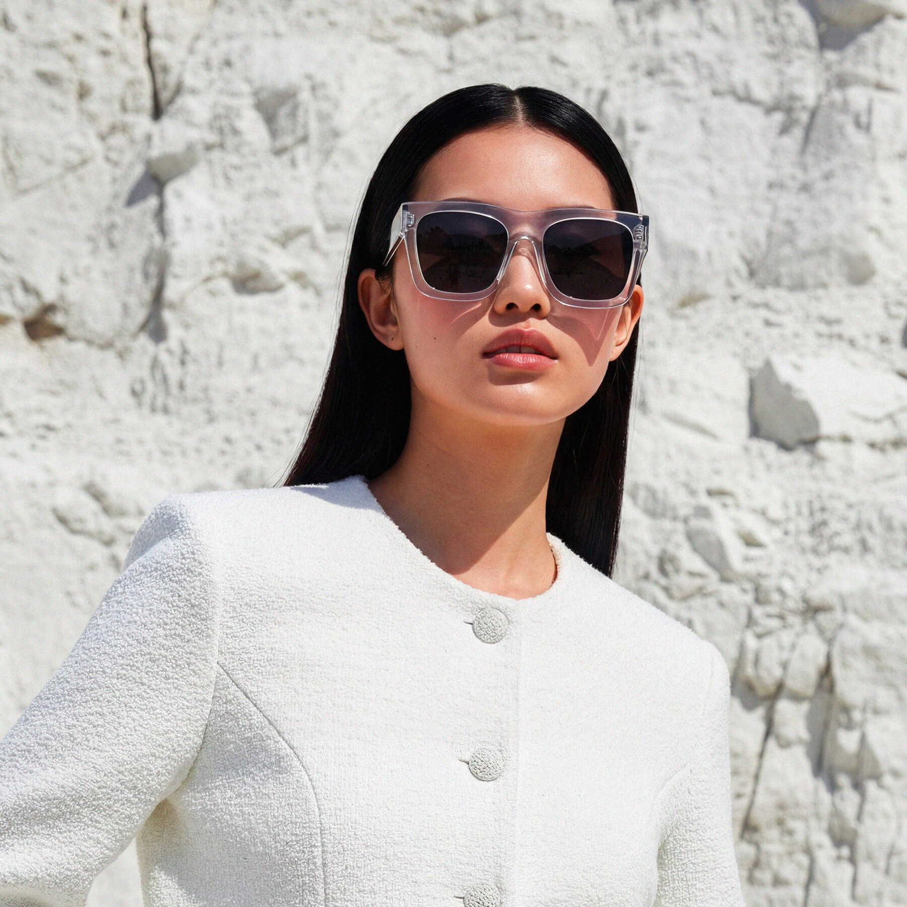 A bold, unisex frame boasting a rectangular silhouette and a 7mm thick front face. Featuring metal details and a transparent inner temple, the Alta is an approachable and wearable take on a statement frame.